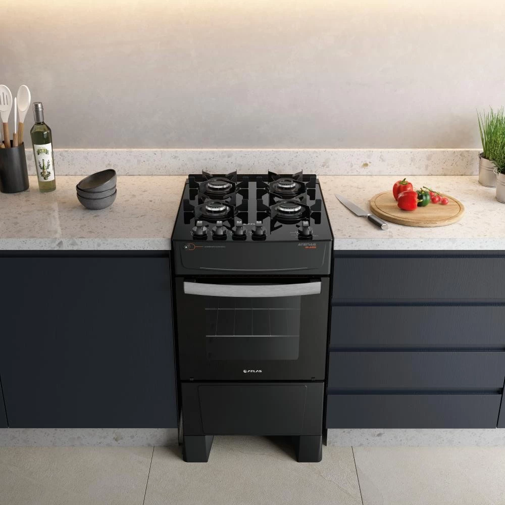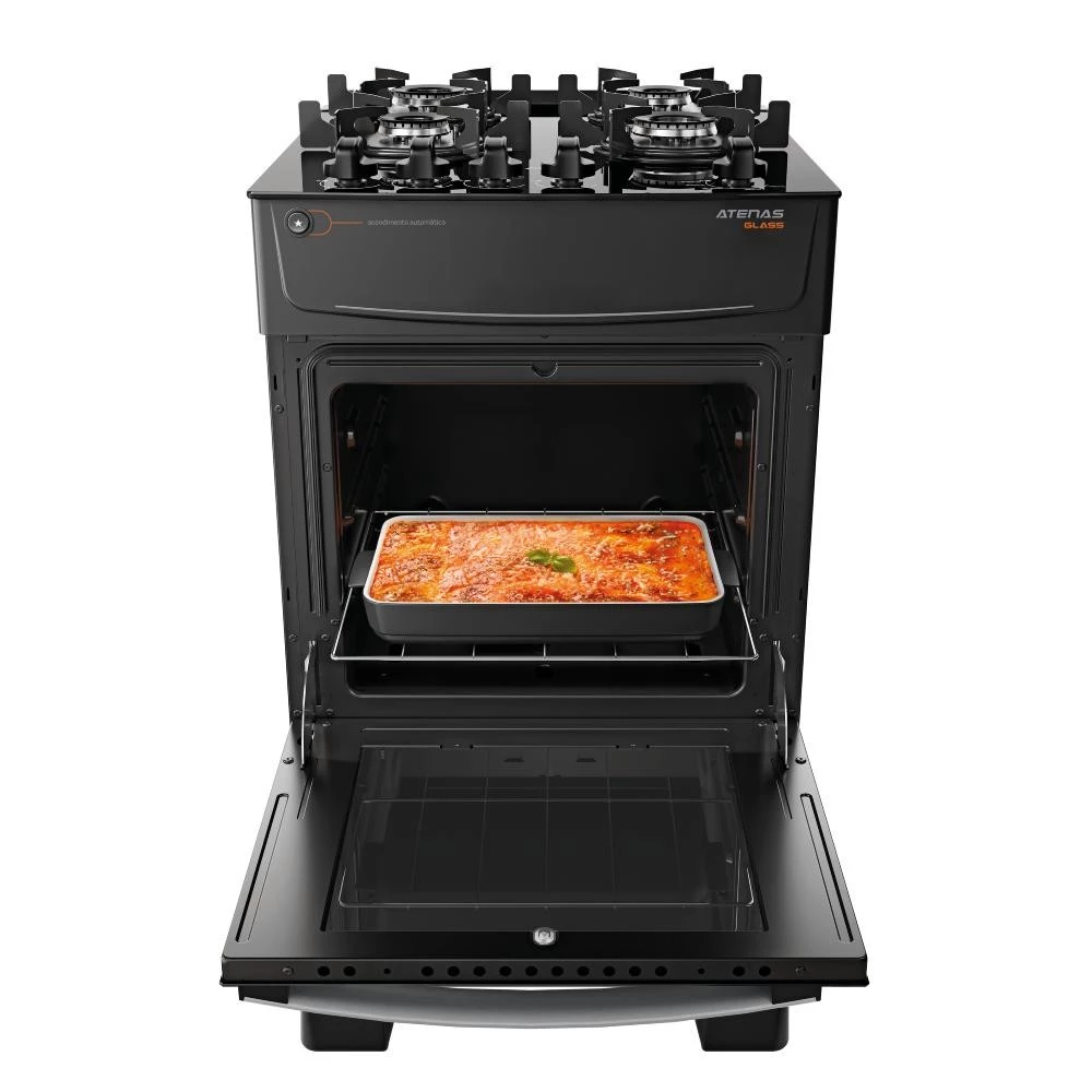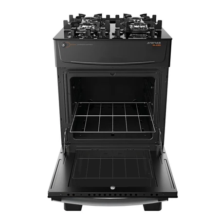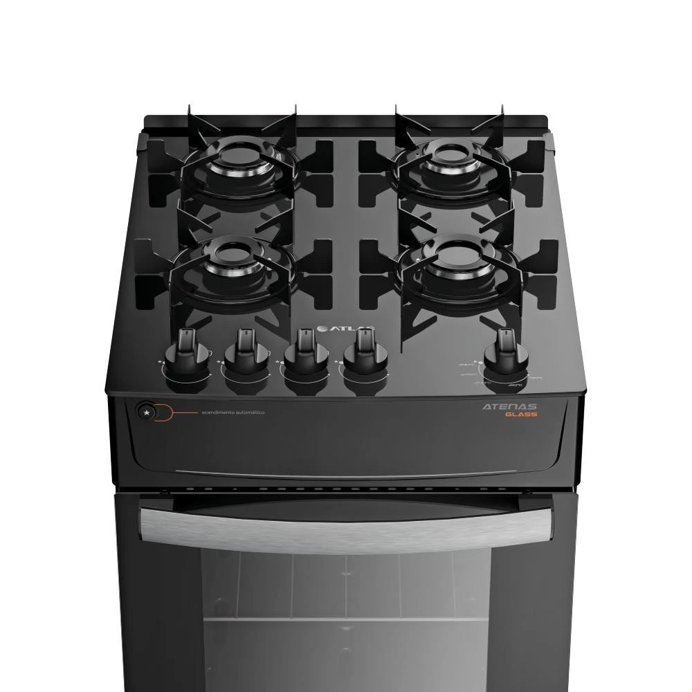 O lançamento Atlas Atenas Glass possui excelente acabamento, mesa de vidro temperado sem bordas, acendimento automático, grades individuais de aço esmaltado com 6 pontos de apoio, que dão mais estabilidade para suas panelas, puxador amplo, botões removíveis e pés altos e robustos, que facilitam na hora da limpeza.