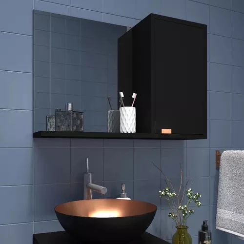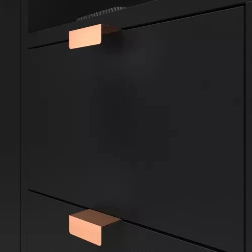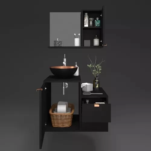 Com cuba e puxadores ornando com detalhes em cobre contrastando com a madeira, lembrando estilo industrial com um toque clean e minimalista.